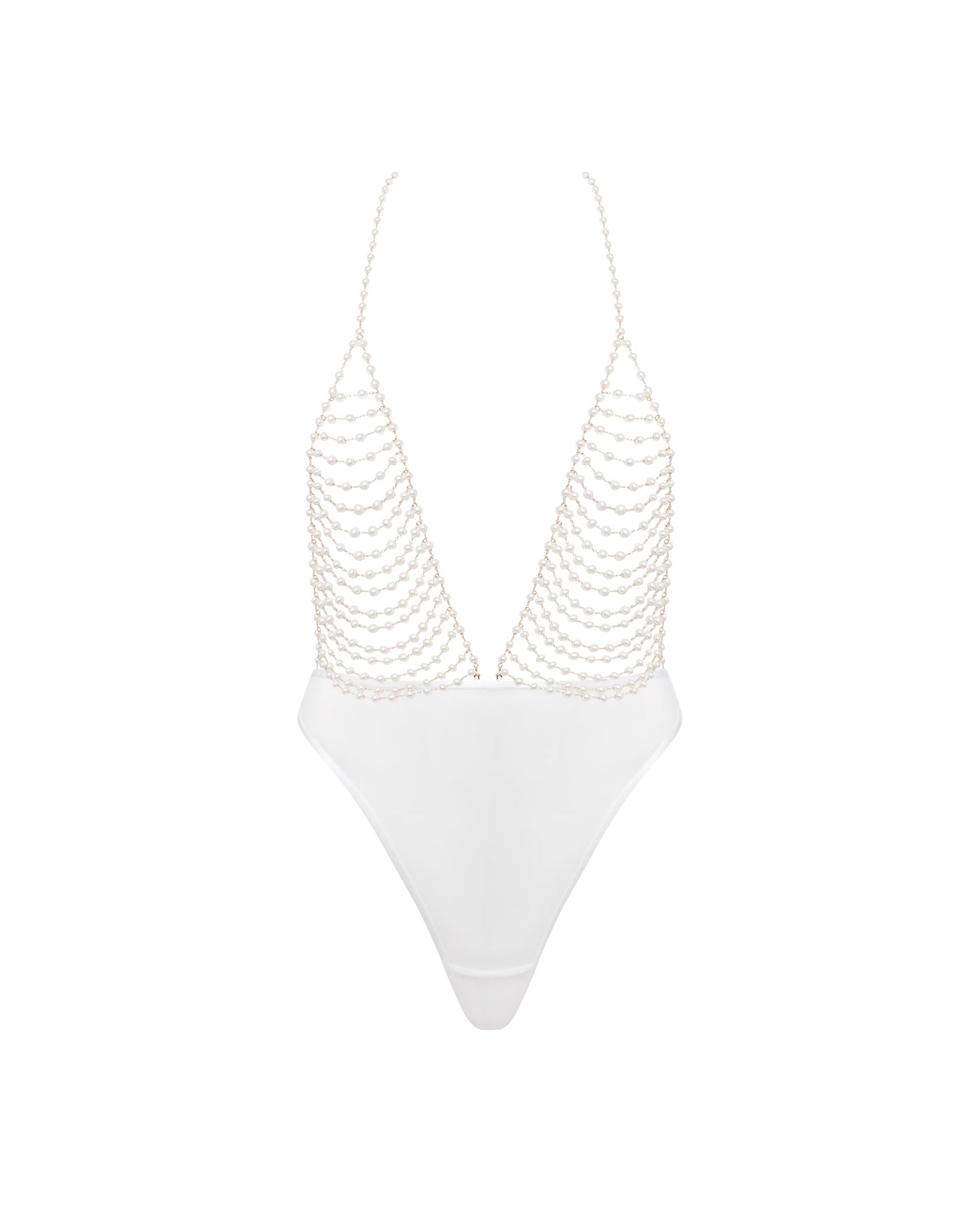 Cascading pearlescent beads and gold-tone chain detailing frame the body beautifully on this Pearl bodysuit. The plunging neckline and directional silhouette add chic sensuality to your wardrobe. This bodysuit features a super soft high-rise thong with a hypoallergenic bamboo gusset for ultimate comfort.