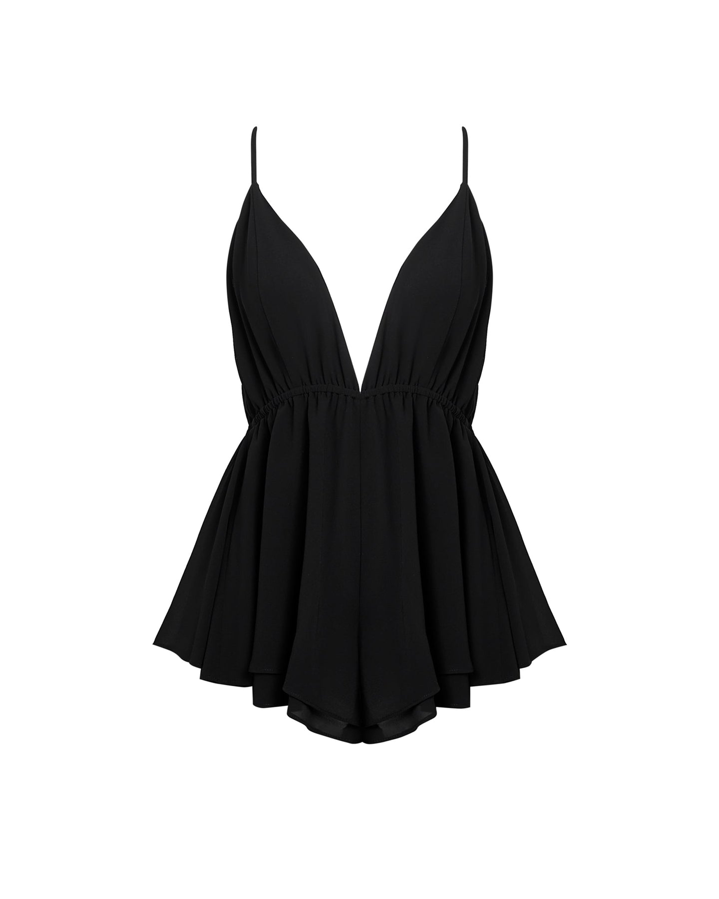 An elegant loungewear piece defined by its deep plunge neckline and delicate floaty ruffled double-layer skirt. Adjustable shoulder and back straps, plus a drawstring waist ensure a personalised fit, while the open back with dipped hem design creates a flattering silhouette. The high-rise thigh cut adds a playful, cheeky dimension to this versatile teddy. Wear night and day, it works well for both.