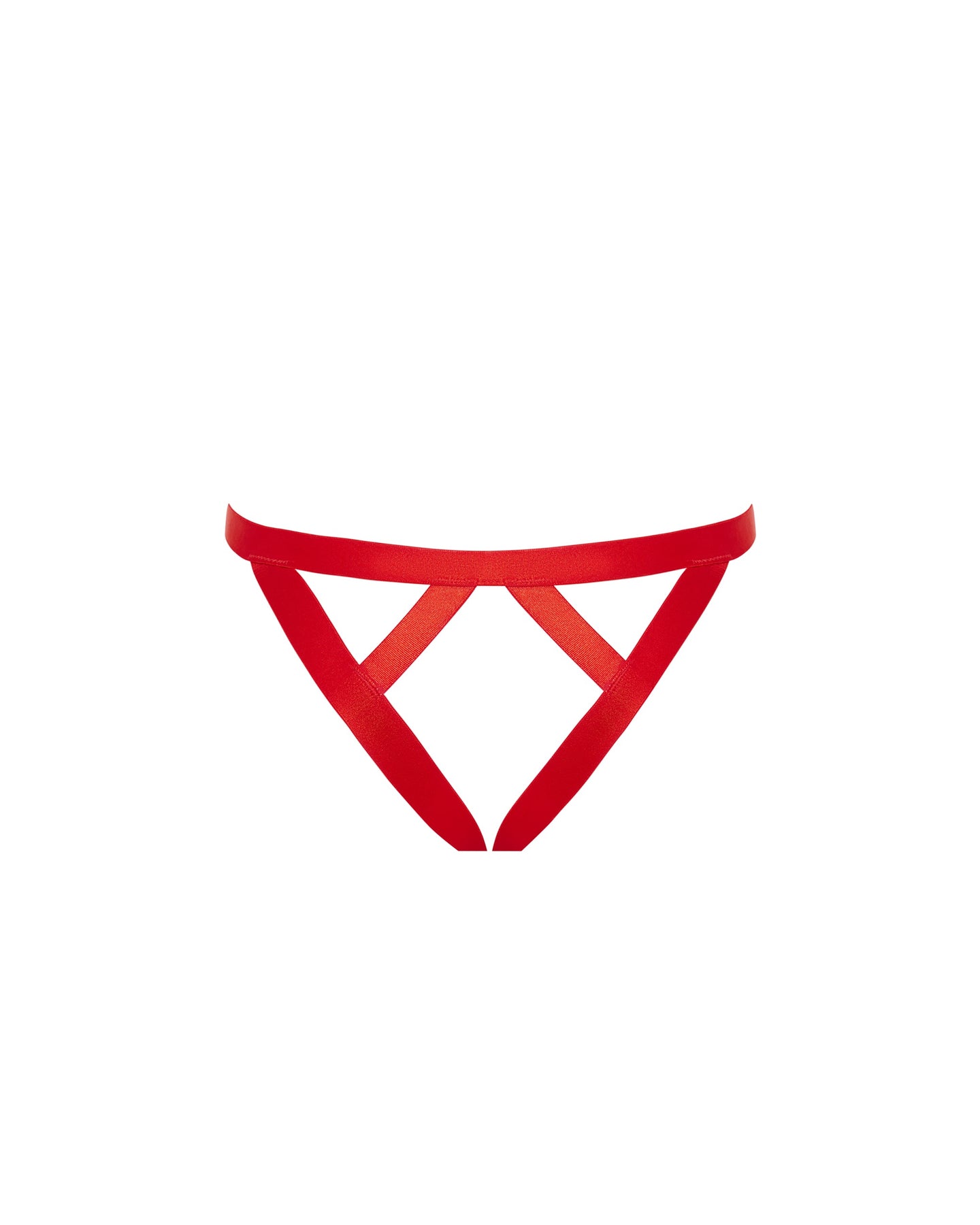 Meet the Ariana Open Brief in a vibrant red. This piece combines bold design with expert craftsmanship, featuring open construction and directional strapping, made with premium elastics. Finished with a hypoallergenic bamboo gusset, these briefs offer a fresh update to your lingerie collection. Pair it with the matching bra, thong, and suspenders for a complete look.