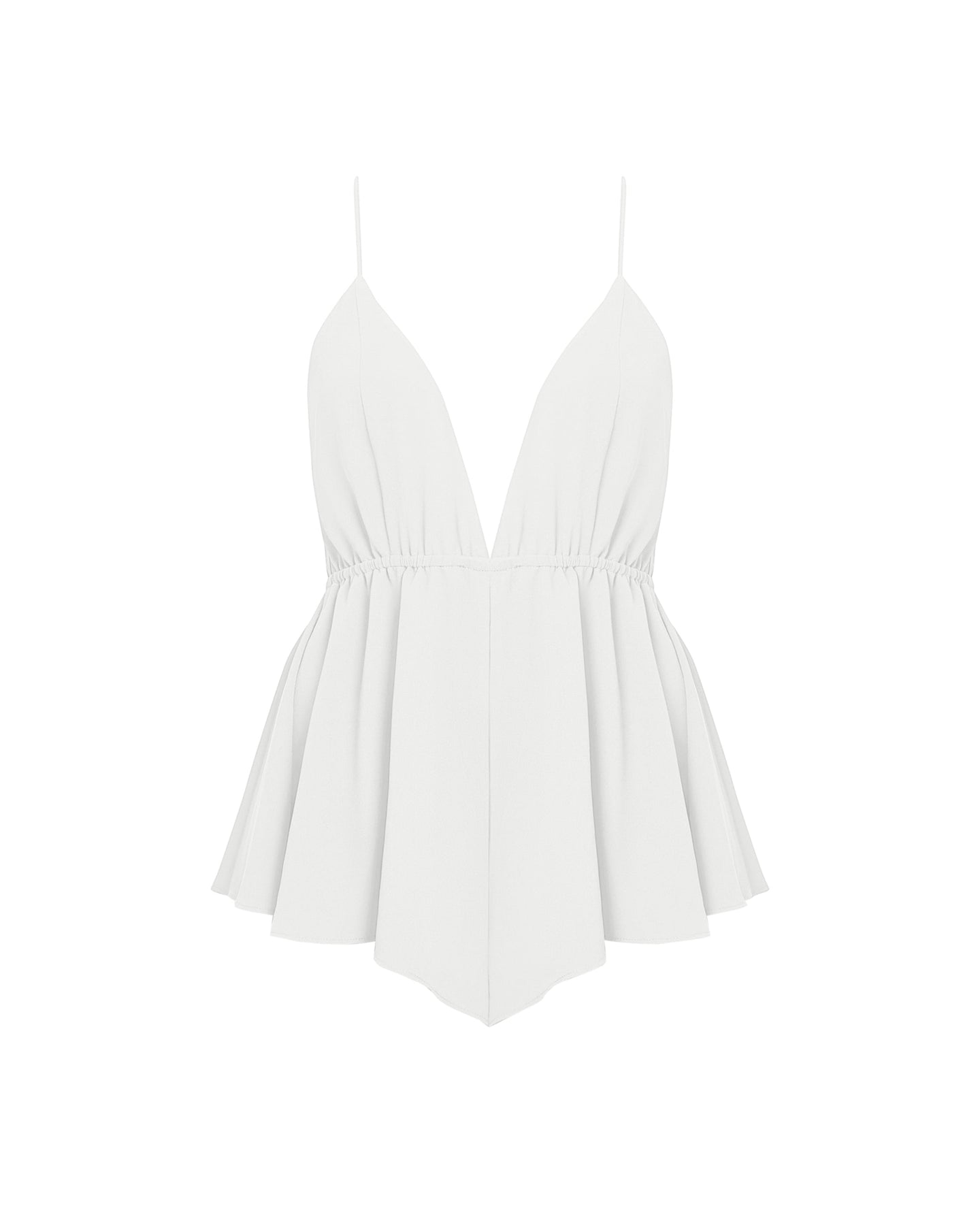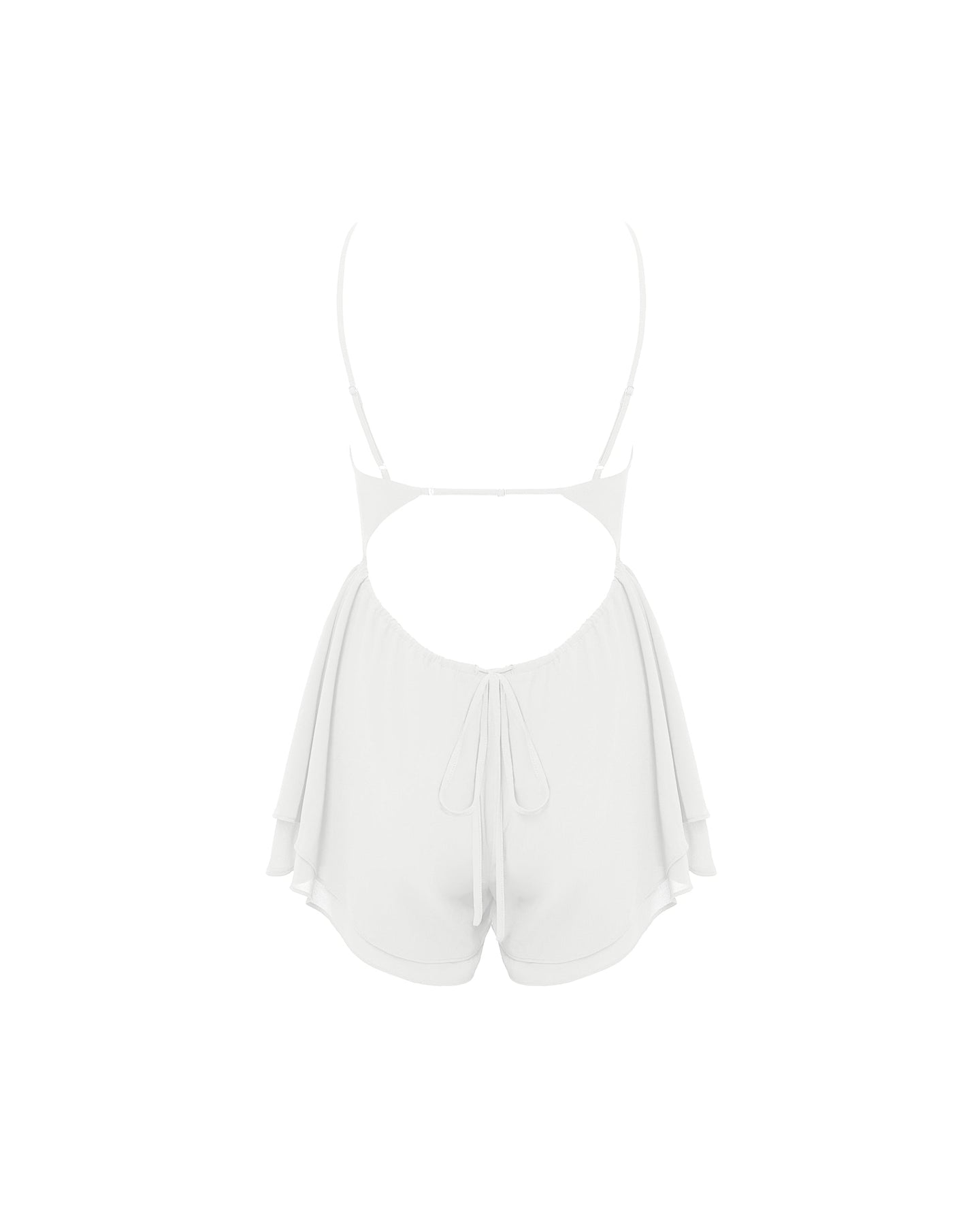 An elegant loungewear piece defined by its deep plunge neckline and delicate floaty ruffled double-layer skirt. Adjustable shoulder and back straps, plus a drawstring waist ensure a personalised fit, while the open back with dipped hem design creates a flattering silhouette. The high-rise thigh cut adds a playful, cheeky dimension to this versatile teddy. Wear night and day, it works well for both.