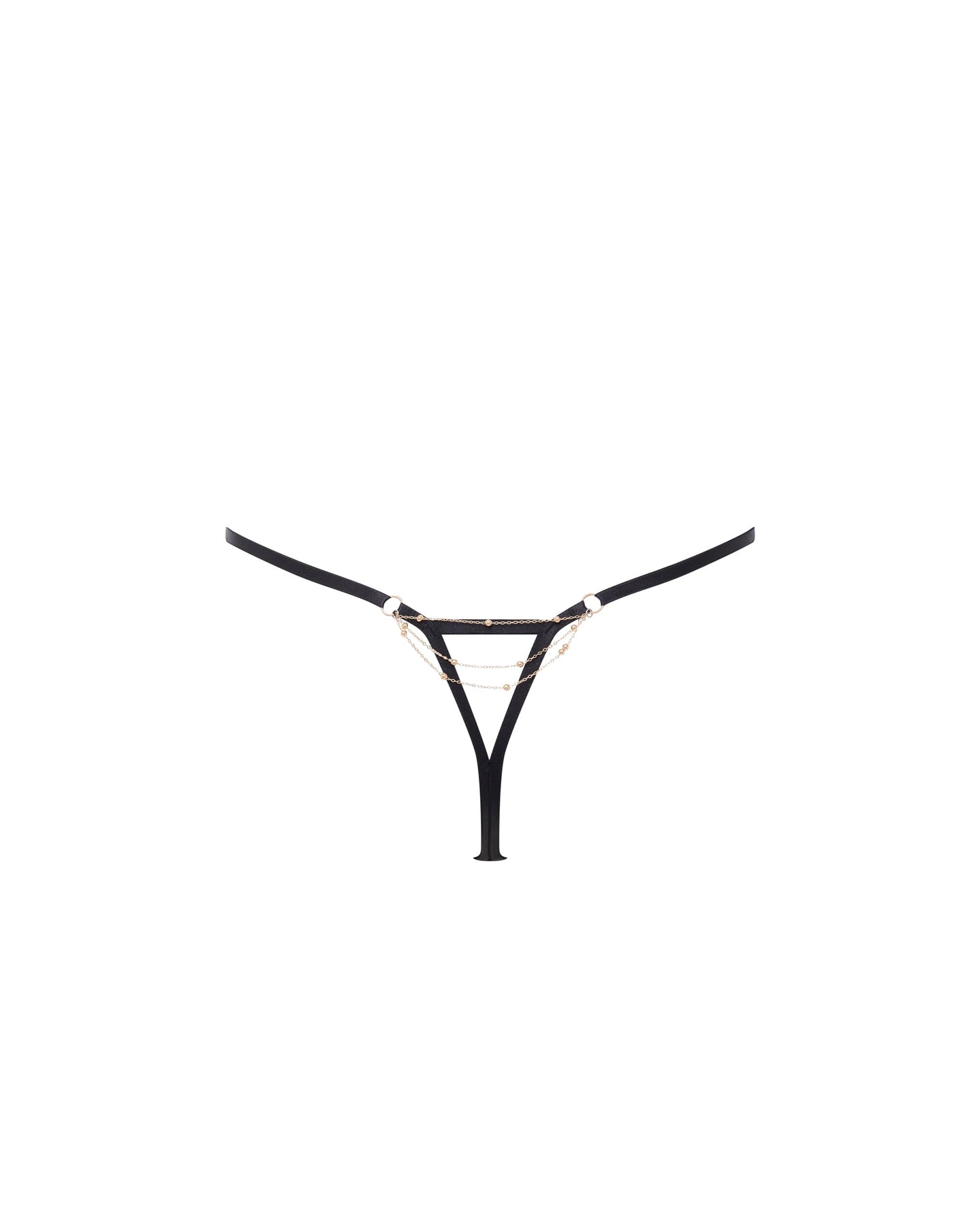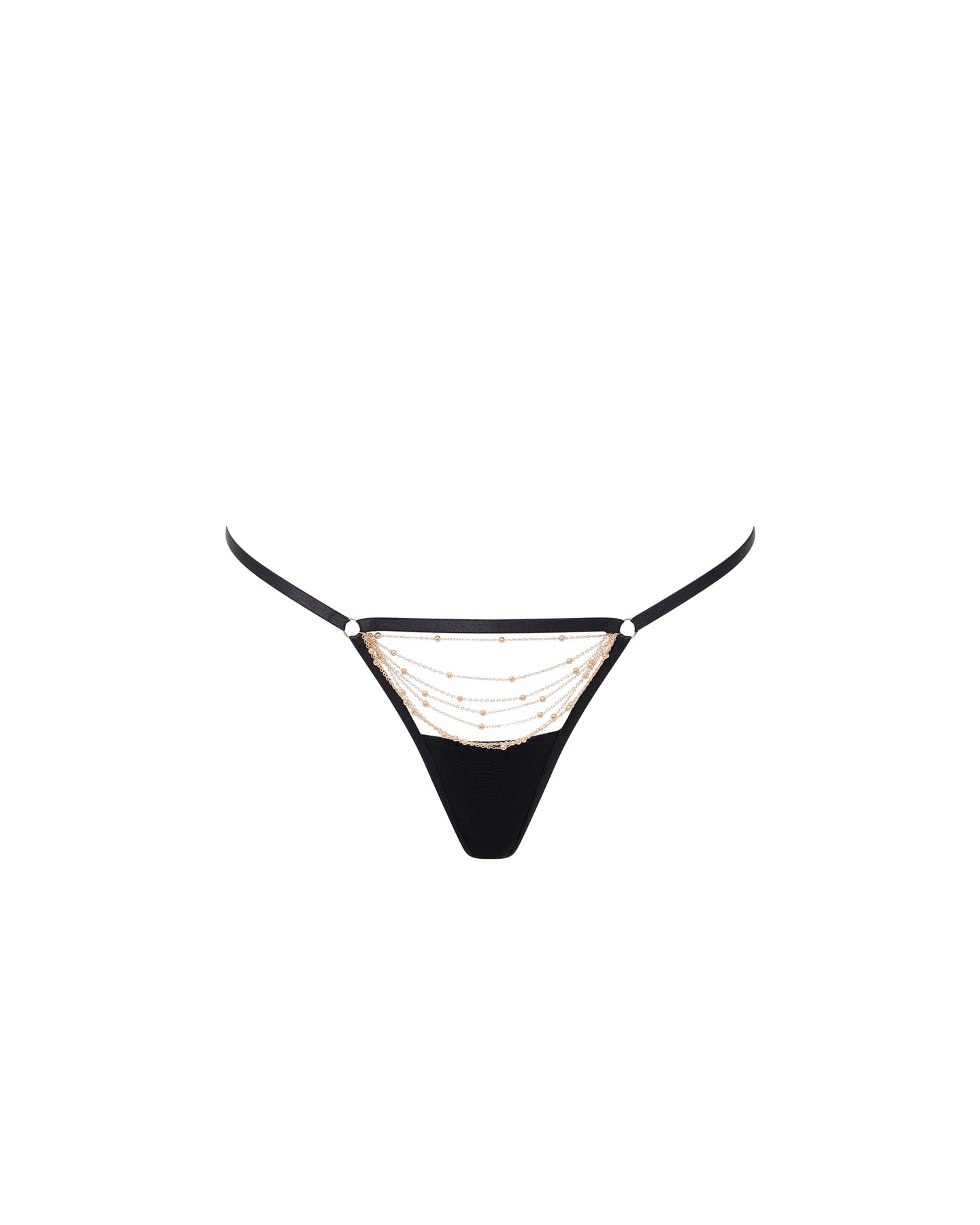 The Frida Thong in black/gold will add a touch of glamour to your underwear drawer. Featuring an open front panel with draped beaded chains, it’s designed to be worn solo or layered into an ensemble. Complete the look with the matching Frida bra, harness and choker.