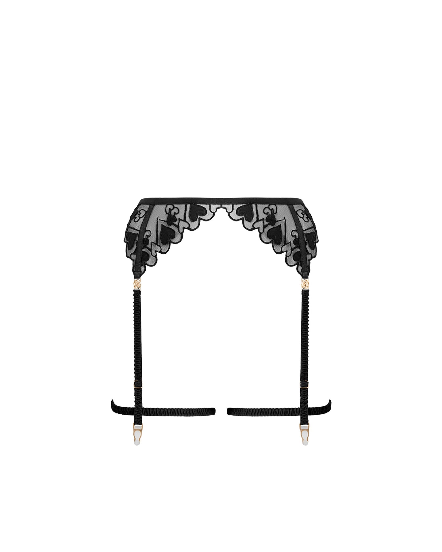 The Harlow Suspender Thigh Harness in black is a modern update on a classic suspender design. Featuring intricate heart embroidery which adorns the sheer mesh skirt, with detachable thigh harness straps for added impact. Complete the set with the matching bra, brief and thong from the range.