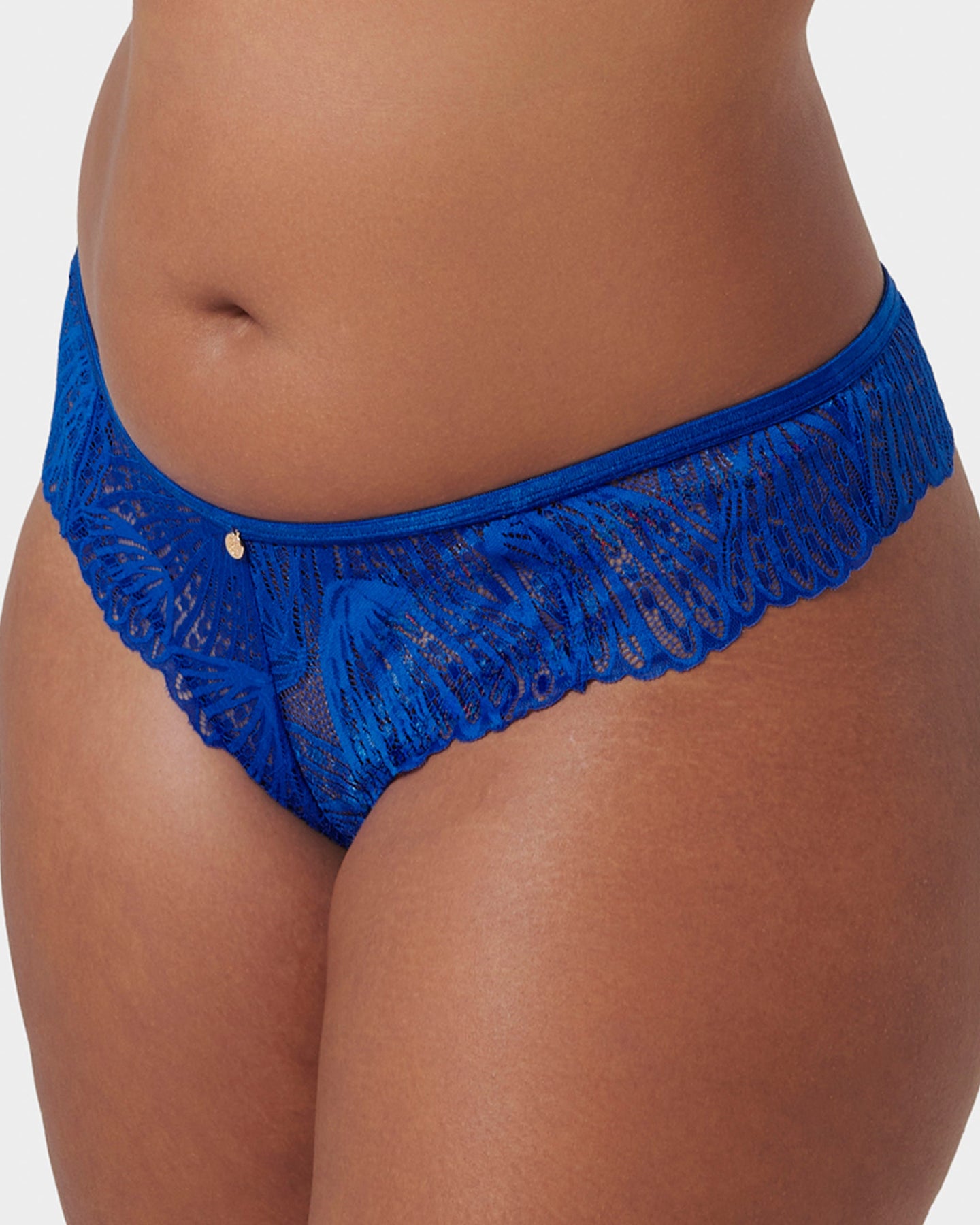 Presented in Egyptian blue, a key colour for the season, this thong features floral lace with symmetrical patterns that flow around the entire silhouette, with a unique triangle keyhole detail to the rear, premium satin bonded edging, signature Bluebella gold hardware and a hypoallergenic bamboo gusset. This style is perfect for those looking for added coverage without compromising style. Pair with the matching bra for the full look.