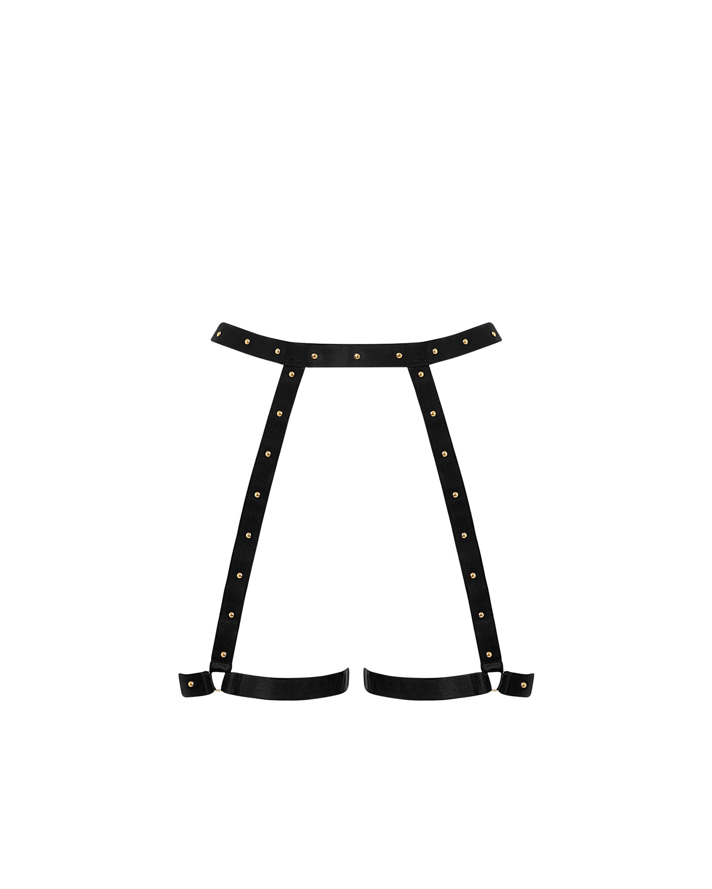 The finishing touch that ties your entire look together. Crafted in sleek premium elastic with gold-tone studs and ring hardware, this thigh harness is a powerful accessory that complements the Sana set perfectly or can be worn as an accessory to your favourite outfit. A small piece that makes big impact.