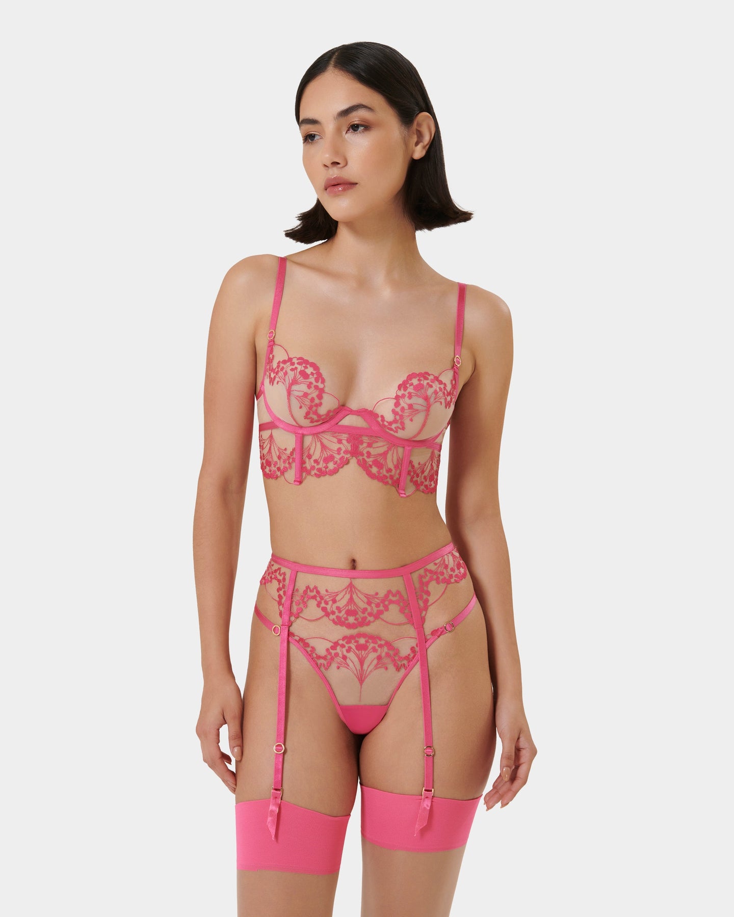 As part of our eco collection, this fresh update of our bestselling Marisa set now comes in vibrant fuchsia pink, crafted from recycled fabrics and combining sustainability with style. Complete this pink lace lingerie set with the matching briefs, thong and suspenders or choose between multiple other colourways.