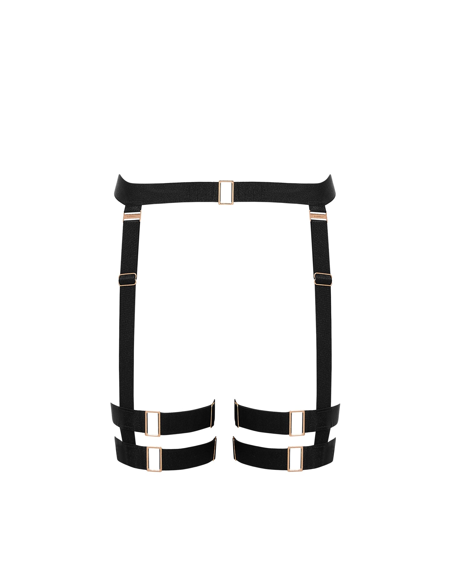Introducing the Trinity thigh harness from Bluebella—a true embodiment of daring femininity and unparalleled allure. With its sleek hue, wide directional straps, and chunky hardware, this exquisite piece is set to make a bold statement and ignite your wildest desires. Its wide directional straps are strategically placed to draw the eye to your most alluring features, elevating your lingerie edit. For an irresistible ensemble, we invite you to pair this thigh harness with the matching pieces.